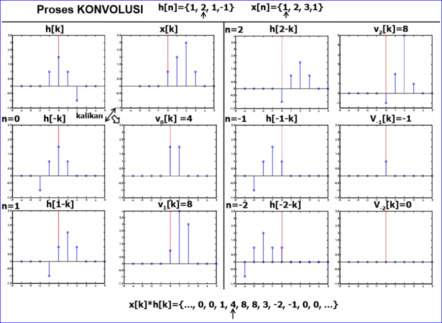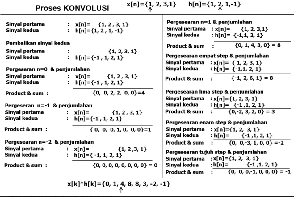 Konvolusi menggabungkan tiga buah sinyal –> sinyal masukan, sinyal keluaran, dan respon impuls. Konvolusi adalah cara matematik untuk mengkombinasikan dua buah sinyal menjadi sinyal dalam bentuk lain.